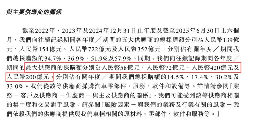 据赛力斯披露,2022至2024年,其向最大供应商的采购金额累计达750亿,而这家供应商正是华为。若计入2025年采购支出,总额已超千亿——仅2025上半年,赛力斯就向华为支付了200亿。