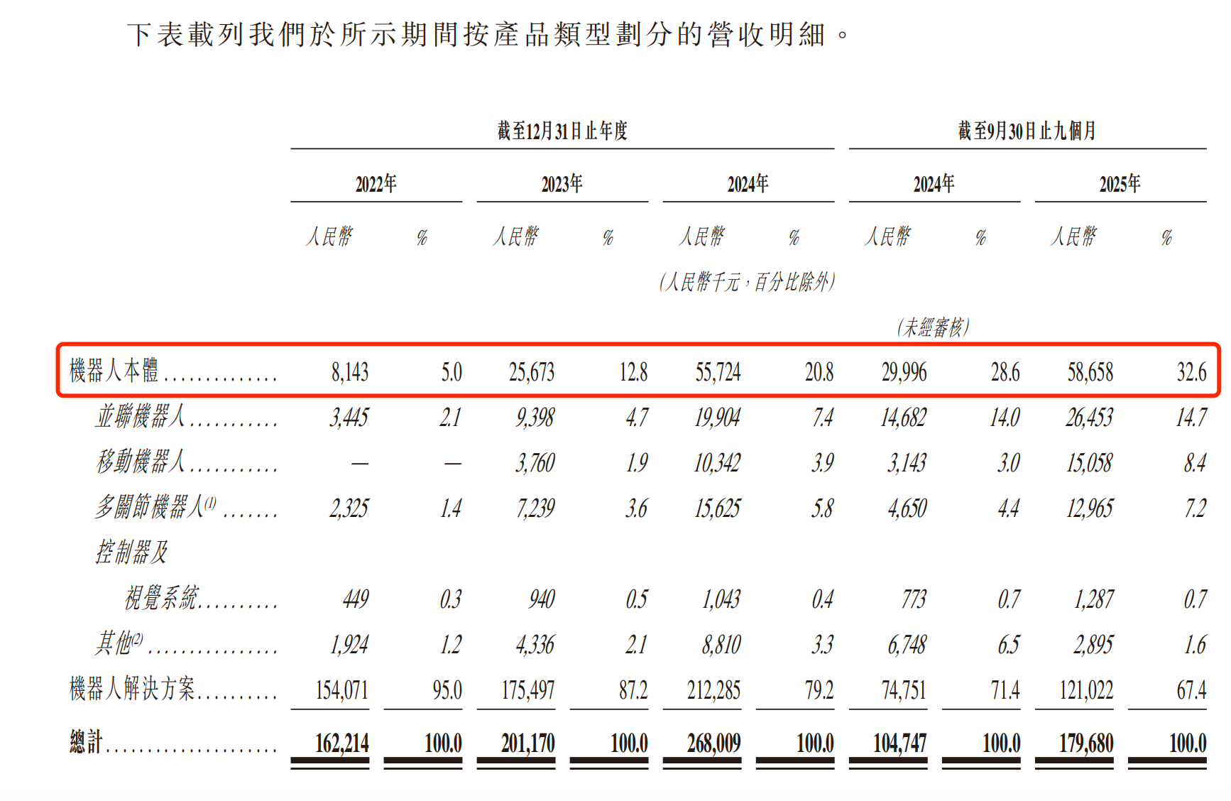 这种“增收不增利”的情况,在准备上市的机器人企业中并不少见,但翼菲科技亏损扩大的趋势,正好赶上了它的营收结构转型期,机器人本体营收占比从2022年的5%上升到2025年前三季度的32.6%。