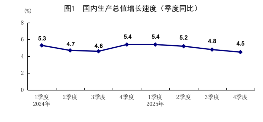1月19日,国家统计局发布了2025年国民经济运行数据。初步核算显示,2025年全年国内生产总值达1401879亿元,按不变价格计算,同比增长5.0%,顺利完成年度增长目标。分季度看,经济增速呈现前高后低态势,一季度增长5.4%,二季度5.2%,三季度4.8%,四季度4.5%。