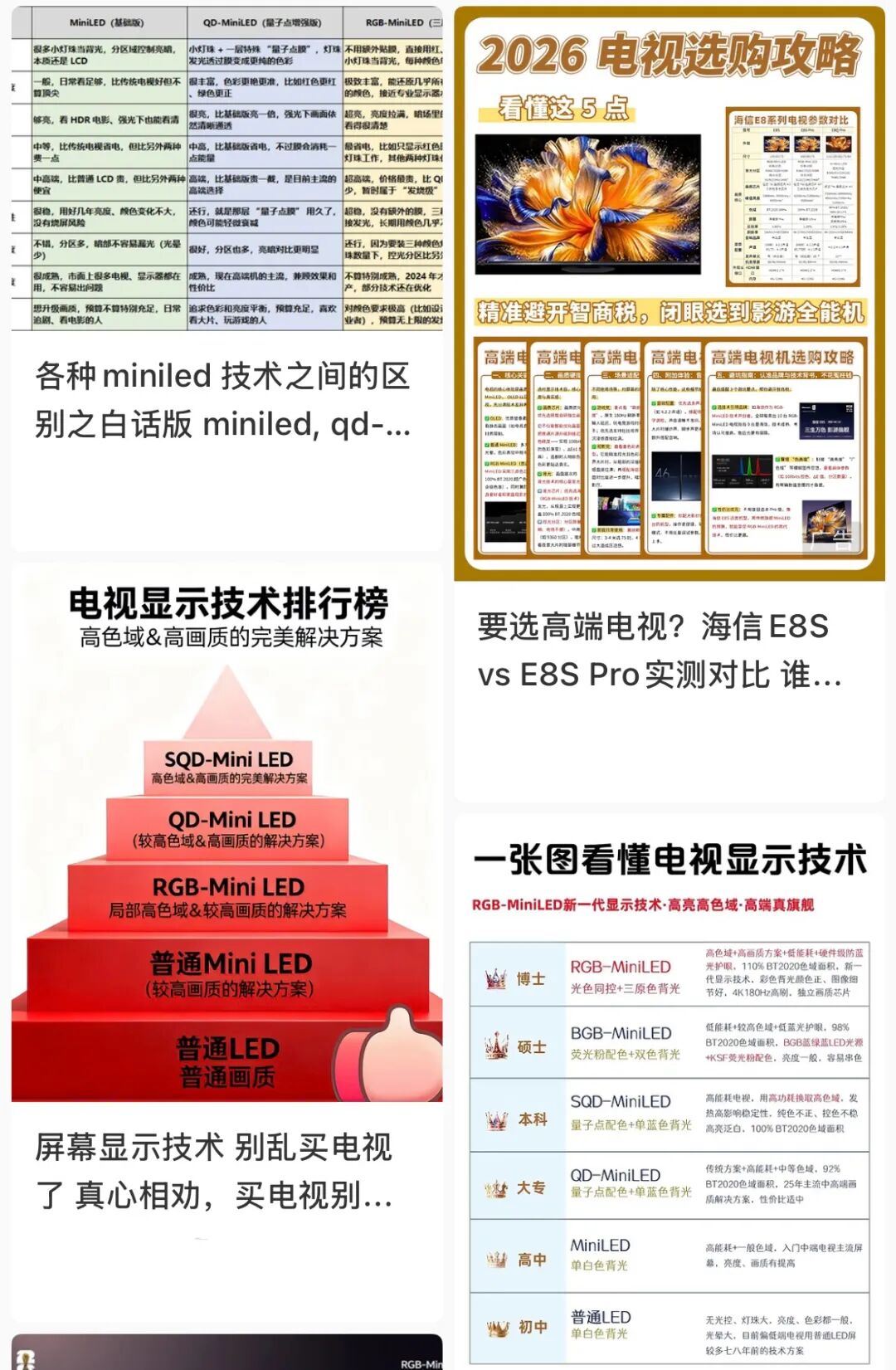 海信凭借世界杯全球官方赞助商的身份,打出“海信电视 中国第一”“中国第一,不止于世界第二”等口号;TCL则以“TCL电视 全球第二”“Mini LED高端电视 中国第一”等标语回应,双方在社媒平台上的技术比拼氛围浓烈,各类LED技术相关的排行榜层出不穷。