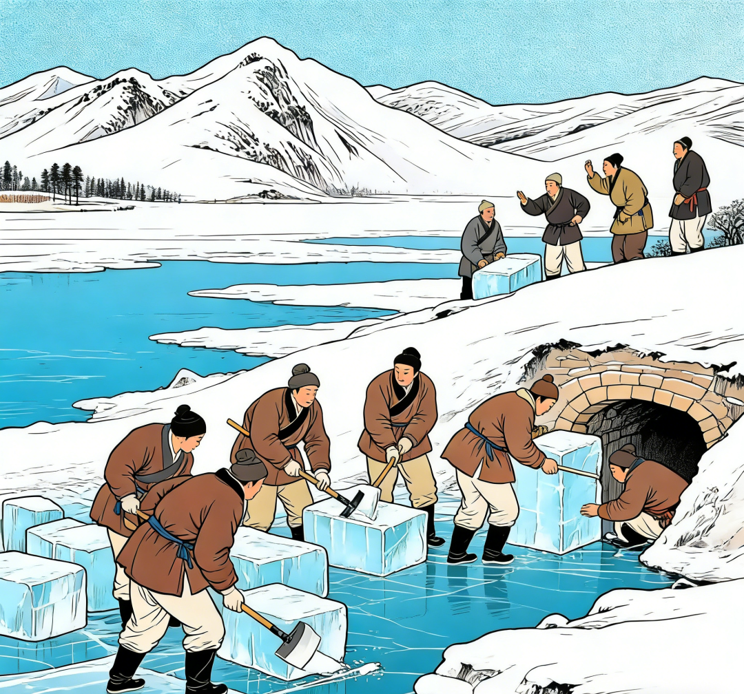 采冰藏冰的习俗自商周延续至明清。《周礼·天官》中“凌人掌冰正,岁十二月斩冰”,说的是周代设“凌人”管藏冰;清代《燕京岁时记》也提到“冬至三九打冰”,取冰后存入地下冰窖,供夏日使用。明清时北京皇家有多处冰窖,清代紫禁城五座冰窖各藏冰五千块,皇家自用之余还赏赐大臣,《帝京景物略》就有“立夏日赐冰”的记载。