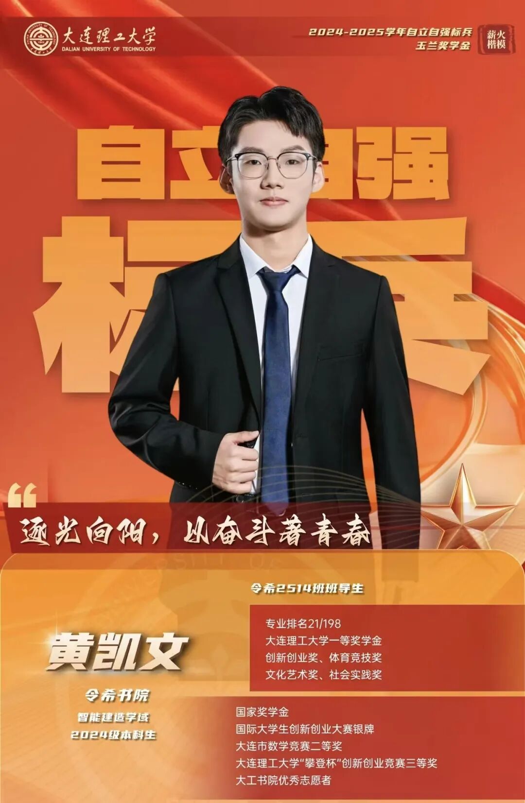 黄凯文的家乡在河南省信阳市潢川县。乡镇小学泥土地操场上奔跑的身影、县城中学路灯下翻卷的英语单词本,是他对“努力”最初的认知。报考大连理工大学的决定,源于2024年1月偶然看到的一则新闻——大连1号—连理卫星成功发射,新闻里“大连理工大学”的字样与火箭金色尾焰一同刻进他心底。“原来课本里的航天梦,离我这么近。”一颗与大工结缘的种子就此悄然萌发。