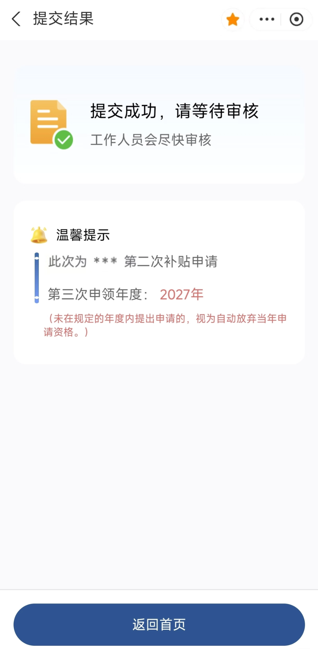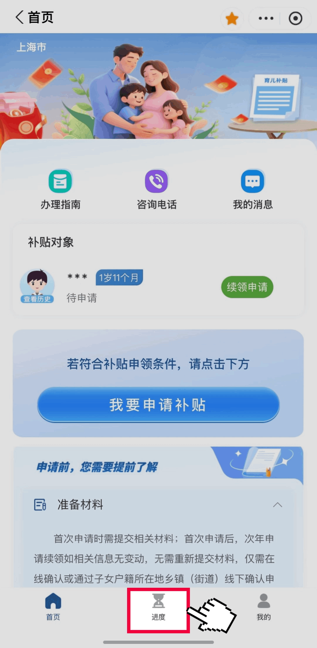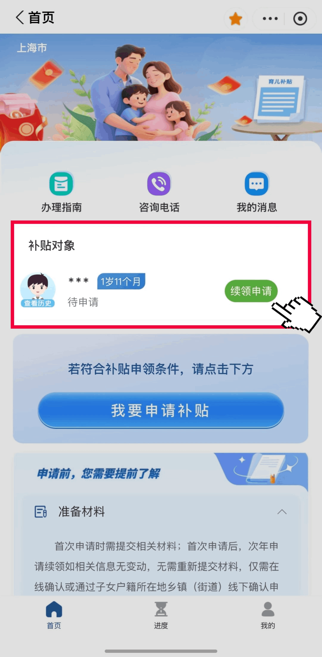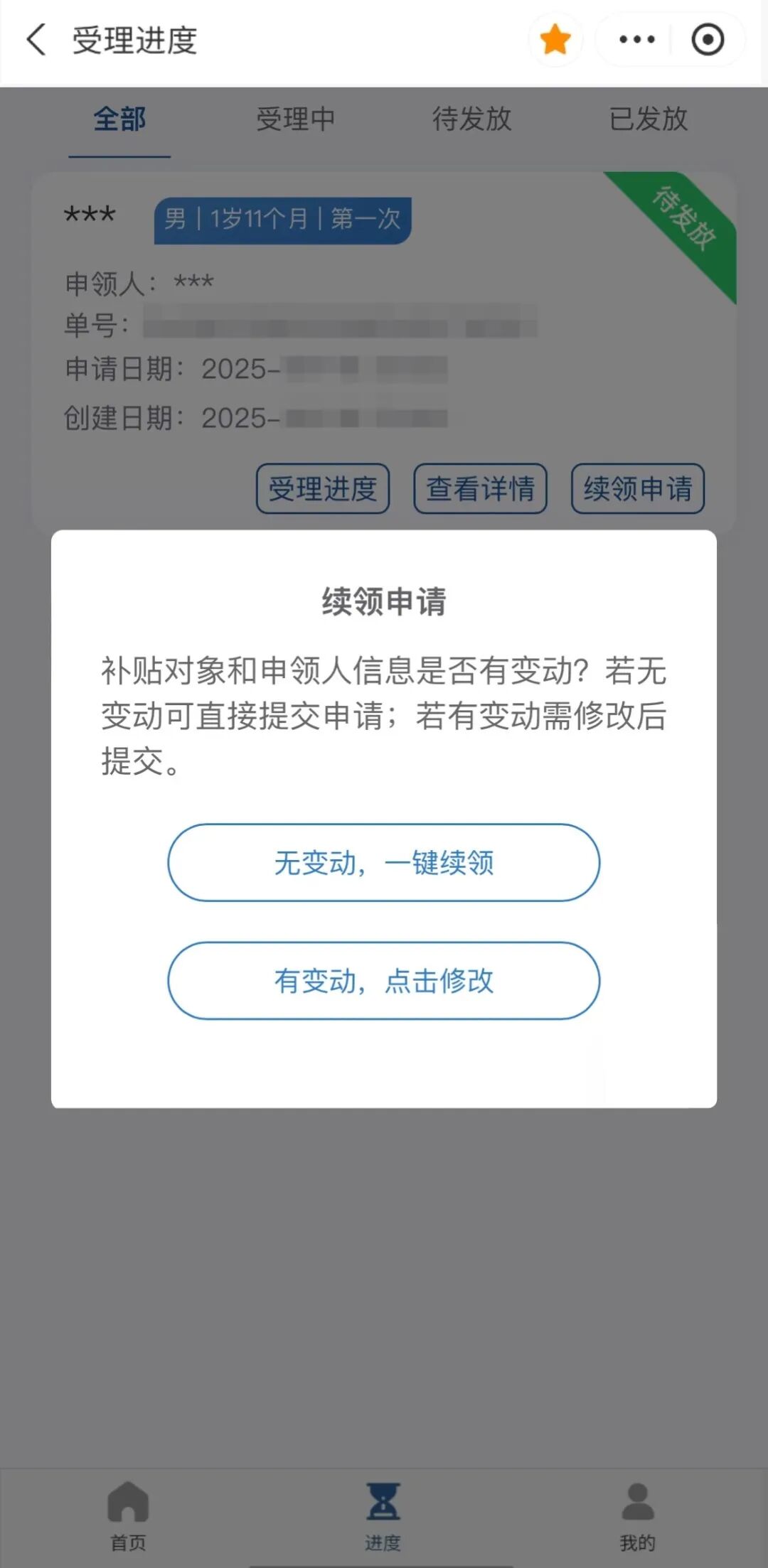 若首页未找到续领入口,可点击下方“进度”栏,进入中间进度页提交续领申请。