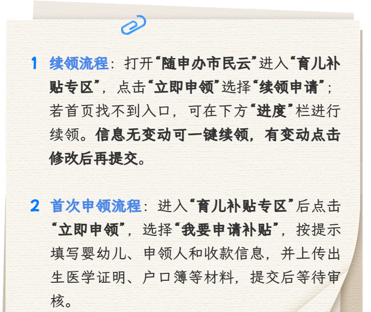 符合条件的家长们,赶紧通过“随申办市民云”平台在线办理吧!具体的续领和首次申领指南如下↓