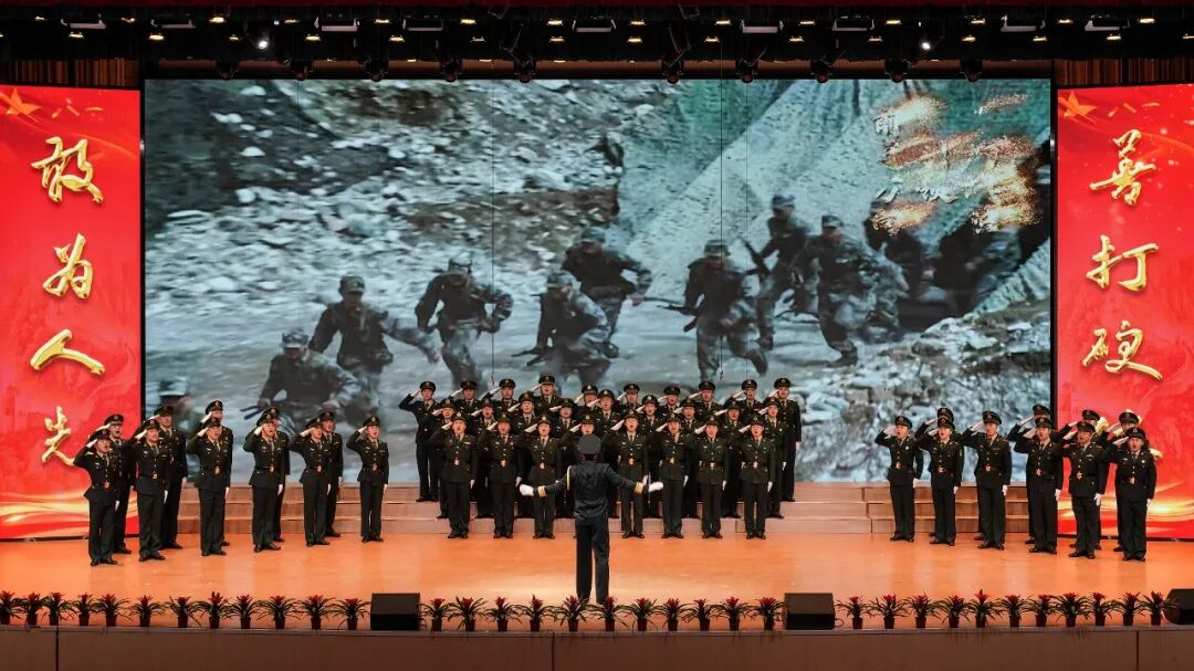舞台上光影交织,情景表演与歌声巧妙融合,《淬火成钢》旋律铿锵,诠释了实战练兵的刚强意志;《响当当的连队呱呱叫的兵》节奏明快,抒发了基层连队的蓬勃朝气;《战争就在下一秒》《我要胜利》等战斗歌曲更是燃爆现场,点燃了官兵的战斗热情。