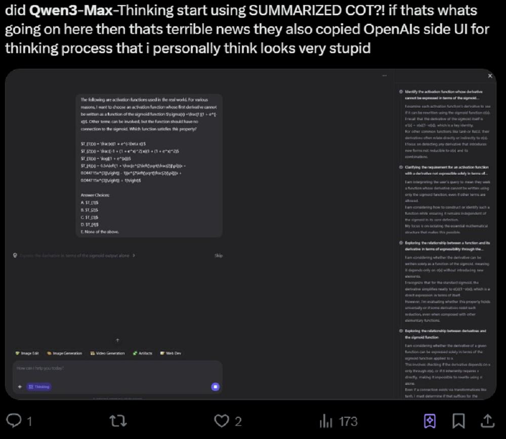 X平台上,也有网友已经尝试了Qwen3-Max-Thinking的推理能力。不过,需要注意的是,Qwen3-Max现在已经隐藏了完整的思维链路径,转而提供思维链总结,有些网友对此表示不接受。