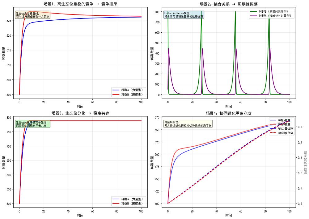 提示词:有两个种群,种群a注重力量的发展,种群b注重速度的发展,请模拟一下两个种群之间的相互作用并给出说明。