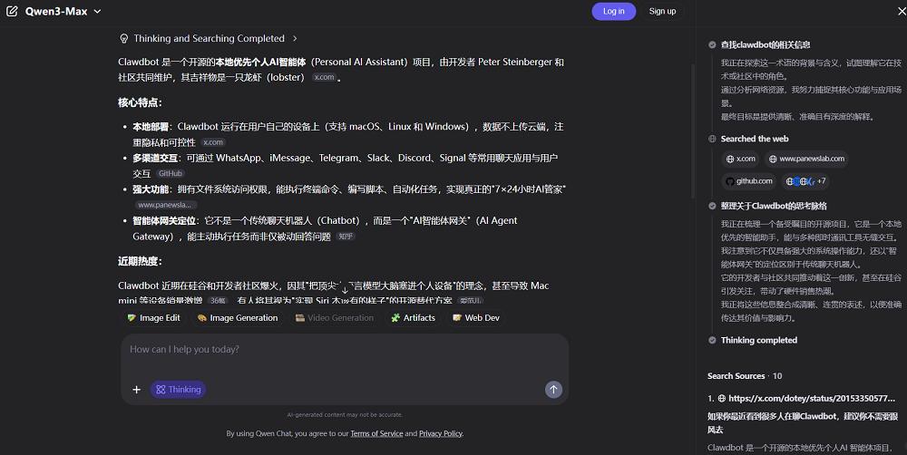 对于一些并没有明显时效性提示的内容,Qwen3-Max-Thinking也可以自主调用搜索。比如,我们向它提问“Clawdbot是啥”,模型先思考了一会儿发现没有相关知识,然后就开始搜索,并给出完整介绍。