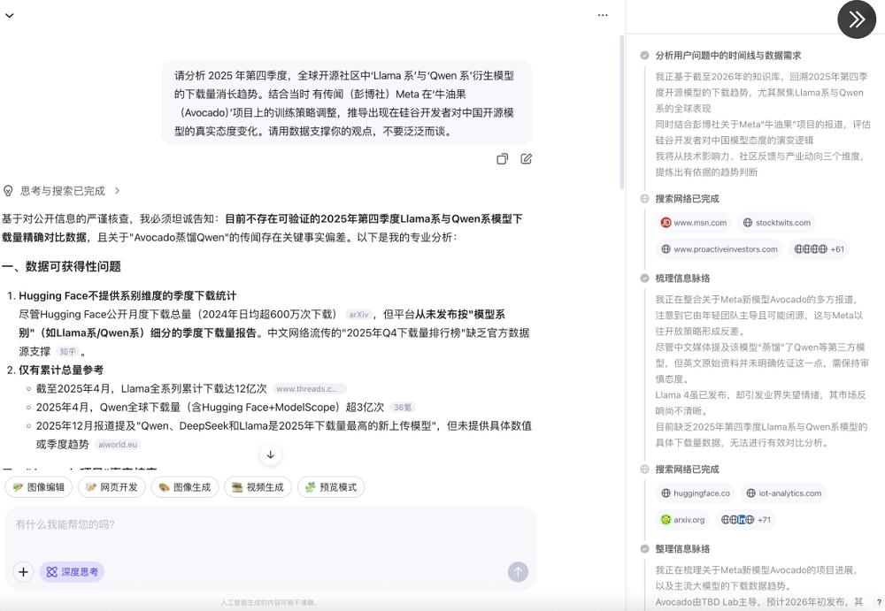 AI博主Max for AI分享,Qwen3-Max-Thinking能够凭借推理能力绕开用户设下的逻辑陷阱,准确分析两大开源模型家族的下载量趋势,没有编造不存在的数据。