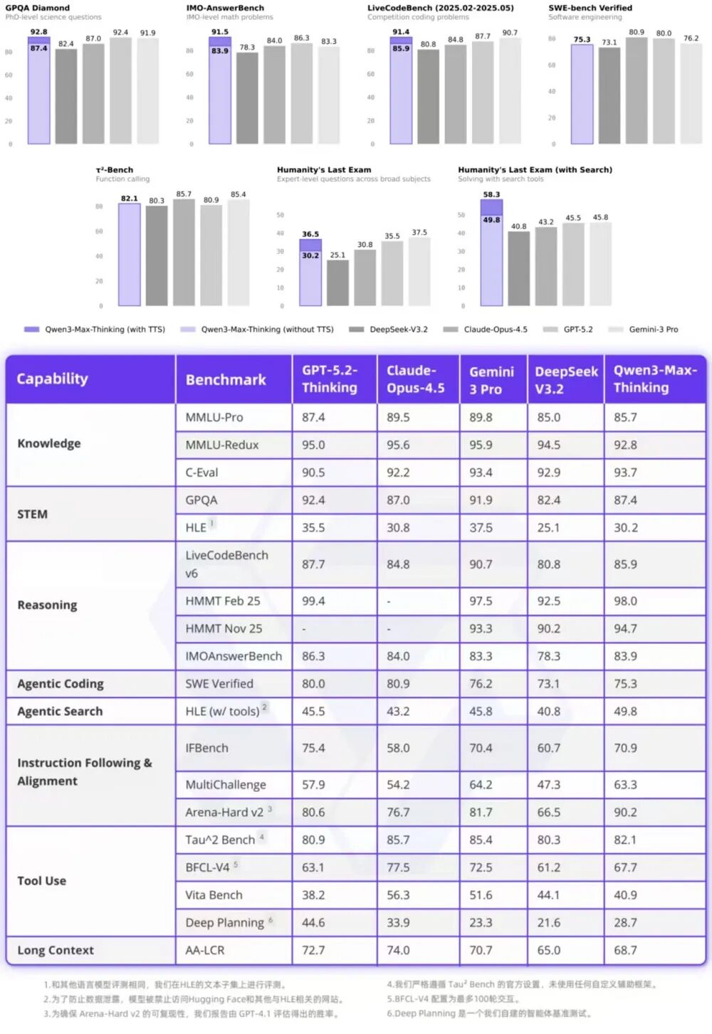 1月26日晚,阿里巴巴推出了Qwen3-Max-Thinking,这是阿里千问系列目前能力最强的旗舰级推理模型,在19项权威基准测试中,Qwen3-Max-Thinking跟GPT-5.2-Thinking、Claude-Opus-4.5和Gemini 3 Pro等顶尖模型打得有来有回,搭配测试时扩展(TTS)能力后,能在不少基准测试上达到SOTA。