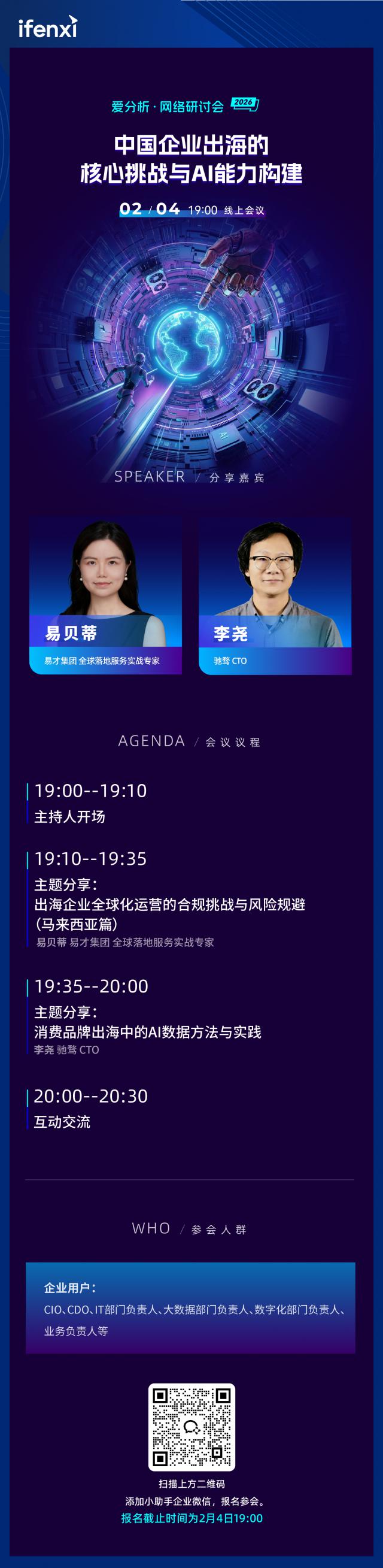 鉴于此,2月4日19:00,爱分析研讨会将精准围绕合规与增长的协同升级展开,特别邀请两位资深专家,分别从全球化运营的风险规避策略和AI数据方法论实践两个维度切入,通过系统的知识分享与真实案例解析,助力中国出海企业夯实安全基础,灵活运用智能工具。
