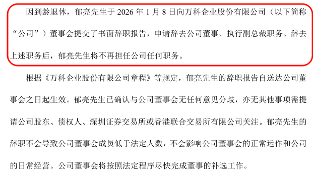 1月8日,万科发布公告称,郁亮因退休原因辞去公司相关职务,且不再在万科担任任何工作,彻底离开公司。