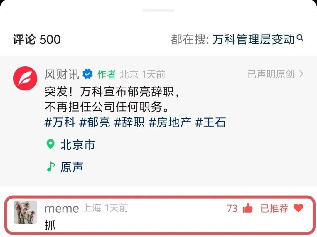 在凤凰卫视风财讯关于郁亮辞职的短视频评论区,一个疑似田朴珺的微信号仅评论了一个字:“抓!”