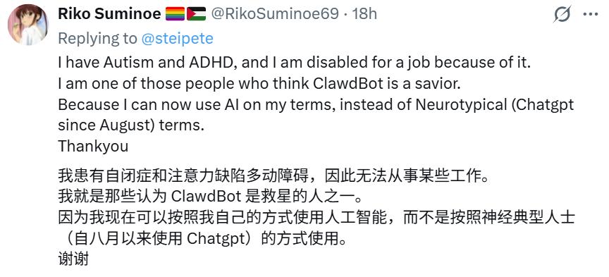 在商标纠纷和利益冲突的争议之外,Moltbot也体现出了其社会价值。