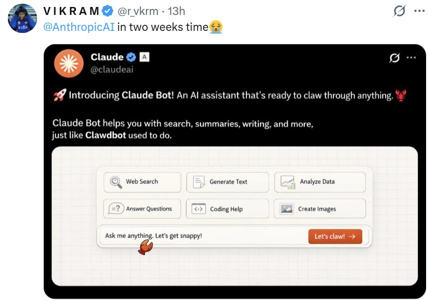 有网友调侃,Anthropic急于维护名称权益,或许是因为计划在两周内推出官方版“Claude Bot”。