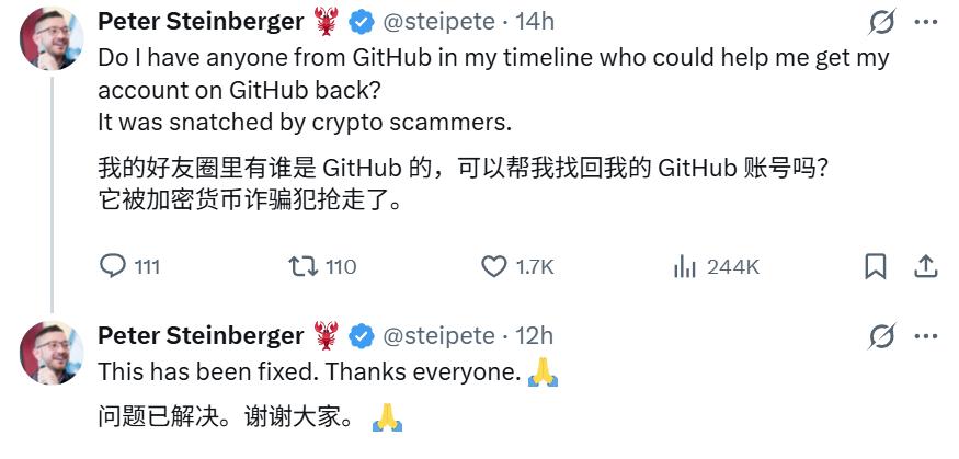 重命名期间,GitHub平台出现故障,导致Peter的个人账号暂时无法正常使用。更严重的是,在X账户更名后的短短10秒内,旧ID“@clawdbot”就被加密货币诈骗者抢注。