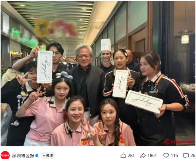 离开店铺前,黄仁勋应店员的请求一起合影,还在餐盘上签了名,期间多次夸赞“深圳的牛肉特别新鲜,味道很好”,并且说以后还会再来。