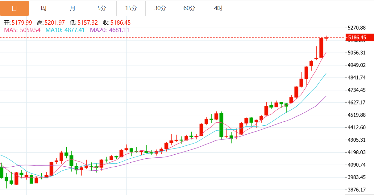 1月28日,现货黄金延续强劲涨势,首次突破5200美元/盎司,创下历史新高,本月累计涨幅已超880美元。