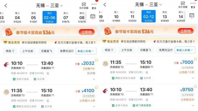 以无锡至三亚的航线为例,2月上旬的多趟直飞航班经济舱价格大多在2000元以上,到了2月12日,该航线更是只剩下公务舱机票,价格高达7000元。