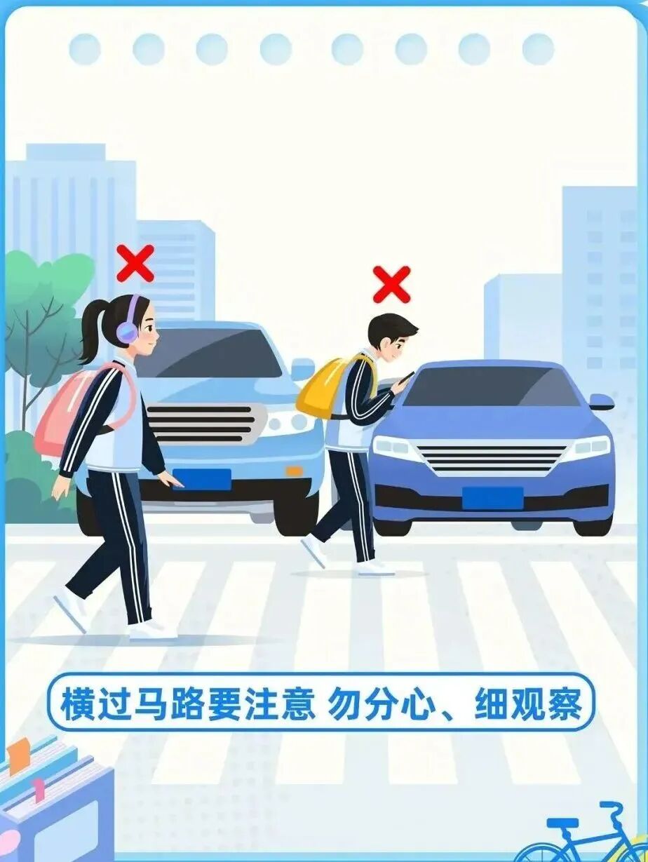 2. 过马路必须走人行横道线,还要做到“一停二看三通过”:停下脚步观察路况,左右看看有没有来车,确认安全后再通过。千万不要翻越马路护栏,也不能闯红灯,更不能一边走路一边看手机,这样很容易忽略周围的危险。