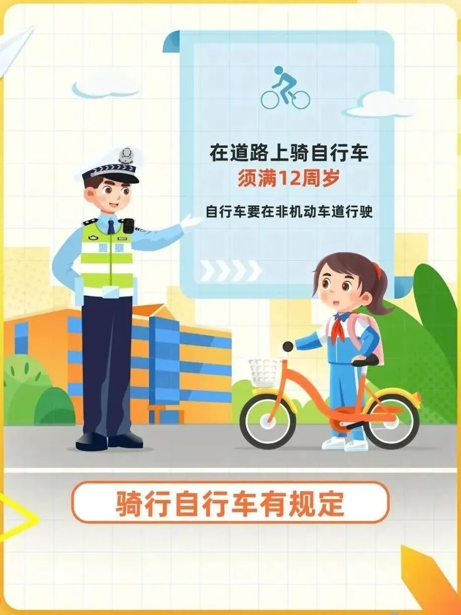 1. 有年龄限制要记清:未满12周岁的同学不能骑自行车上路,未满16周岁的同学不能骑电动自行车。这是为了大家的安全考虑,千万不要违反规定。