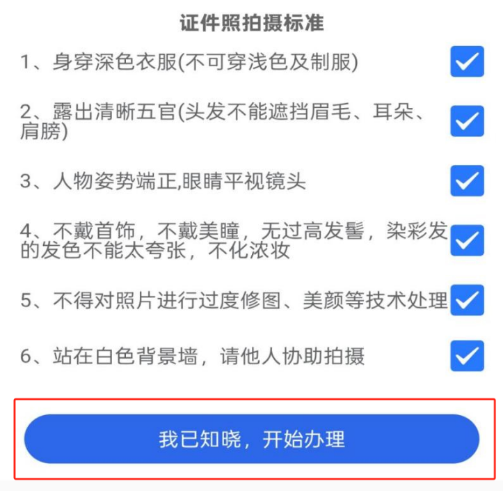 先看看拍照要求,确认后点击【直接拍照】。拍照前得把《证件照拍摄标准》里的所有选项都勾选上,才能进入拍摄界面。