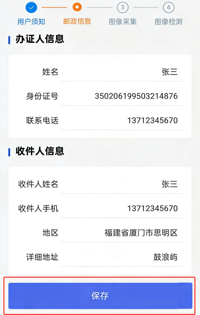 系统会自动填好办证人信息,大家需要补充收件人信息,像姓名、电话、地址这些,填完点击【保存】。