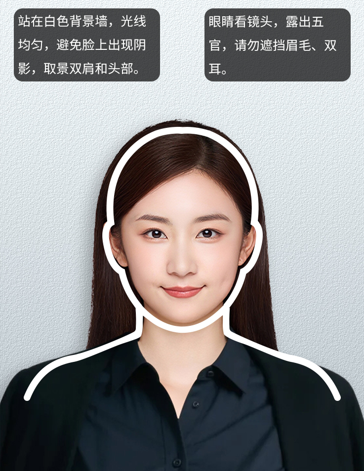 拍摄时把面部对准屏幕里的白框,保持姿势端正再点击拍摄。拍完可以预览照片,满意的话就点击【确认上传】,不满意就点【重新拍摄】。