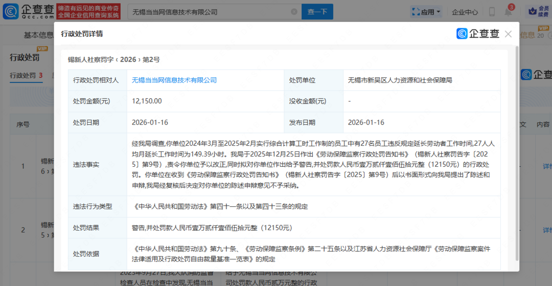 近期一则行政处罚信息显示,无锡当当网信息技术有限公司因违反劳动法相关规定,被当地人力资源和社会保障局处以警告并罚款12150元。
