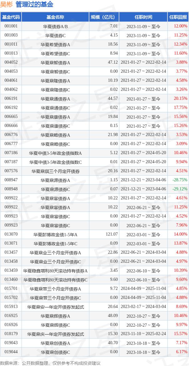 吴彬先生拥有金融硕士学位,为中国国籍。他于2015年7月加入华夏基金管理有限公司,入职后曾担任固定收益部研究员一职。在基金经理岗位上,吴彬曾于2021年1月27日至2022年2月14日期间,同时担任华夏鼎富债券型证券投资基金、华夏鼎智债券型证券投资基金、华夏鼎隆债券型证券投资基金、华夏鼎略债券型证券投资基金以及华夏鼎琪三个月定期开放债券型发起式证券投资基金的基金经理;2021年1月27日至2024年5月20日期间,担任华夏中债3-5年政策性金融债指数证券投资基金基金经理;2021年1月27日起,陆续担任华夏鼎通债券型证券投资基金、华夏鼎康债券型证券投资基金的基金经理;2021年12月21日至2023年4月6日期间,担任华夏鼎源债券型证券投资基金基金经理;2022年3月1日起,担任华夏彭博巴克莱中国政策性银行债券1-5年指数证券投资基金基金经理;2022年6月10日起,担任华夏稳鑫增利80天滚动持有债券型证券投资基金基金经理;2022年6月21日起,再次担任华夏鼎富债券型证券投资基金基金经理,并于同日起至2024年3月4日期间担任华夏鼎业三个月定期开放债券型证券投资基金基金经理;2022年10月27日起,担任华夏鼎辉债券型证券投资基金基金经理;2023年2月17日至2024年3月4日期间,担任华夏鼎安一年定期开放债券型发起式证券投资基金基金经理;2023年11月9日起,同时担任华夏债券投资基金与华夏希望债券型证券投资基金的基金经理;2024年4月9日至2025年11月4日期间,担任华夏鼎誉三个月定期开放债券型证券投资基金基金经理;2023年11月10日至2025年2月24日期间,担任华夏鼎庆一年定期开放债券型发起式证券投资基金基金经理。