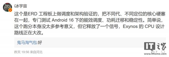 这是在ERD工程板上进行调度和架构验证的产物,是把不同代、不同定位的核心强行整合在一起,专门用于测试Android 16系统下的能效调度、功耗迁移以及稳定性。简单来说,这个跑分本身没有太多参考意义,但它传递出一个信号,那就是Exynos的CPU设计路线正在进行重大改变。