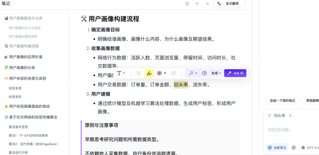 在ThetaWave AI的笔记面板中,除了文字、图表等内容的基础编辑功能,用户还能选中特定内容,进行AI查询、AI润色、AI配图、翻译等个性化编辑与学习操作。