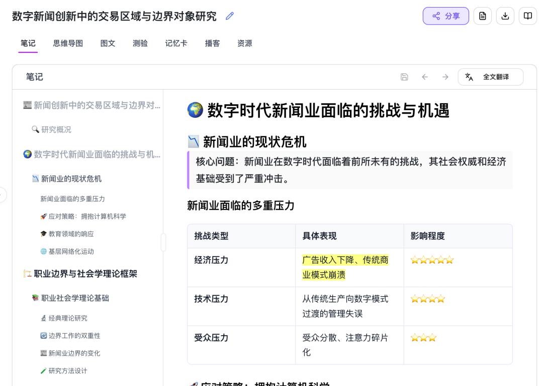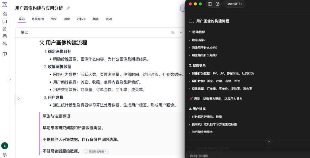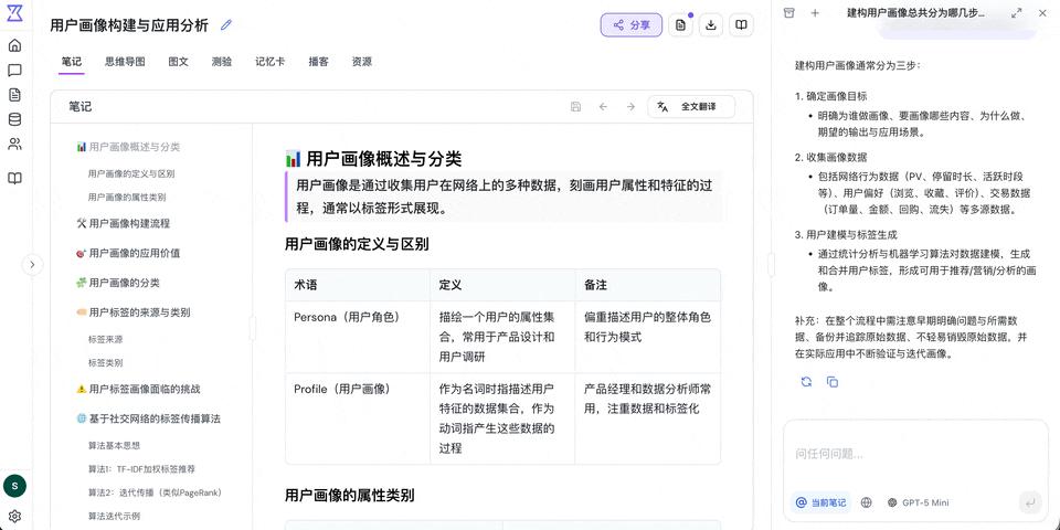 其一,针对现成多模态资料(如课堂PPT、论文、音频、网站、Youtube内容等)的笔记生成、知识总结与知识问答功能;