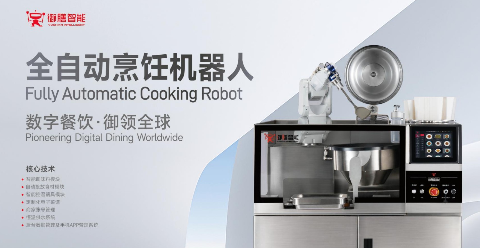御膳智能成立于2021年6月,一直致力于全自动烹饪机器人的自主研发和产业化应用。公司以具身智能机器人技术为核心,深度结合高精度机器人控制系统与AI多模态大模型,打造了软硬件一体化的数字餐饮解决方案。