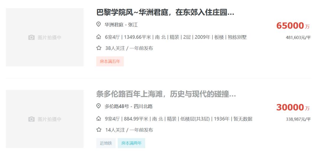 以上海为例,链家平台挂出37套过亿豪宅,最贵独栋别墅挂牌价6.5亿,一套老洋房挂牌3亿,还有汤臣一品、古北壹号、翠湖天地等知名楼盘。