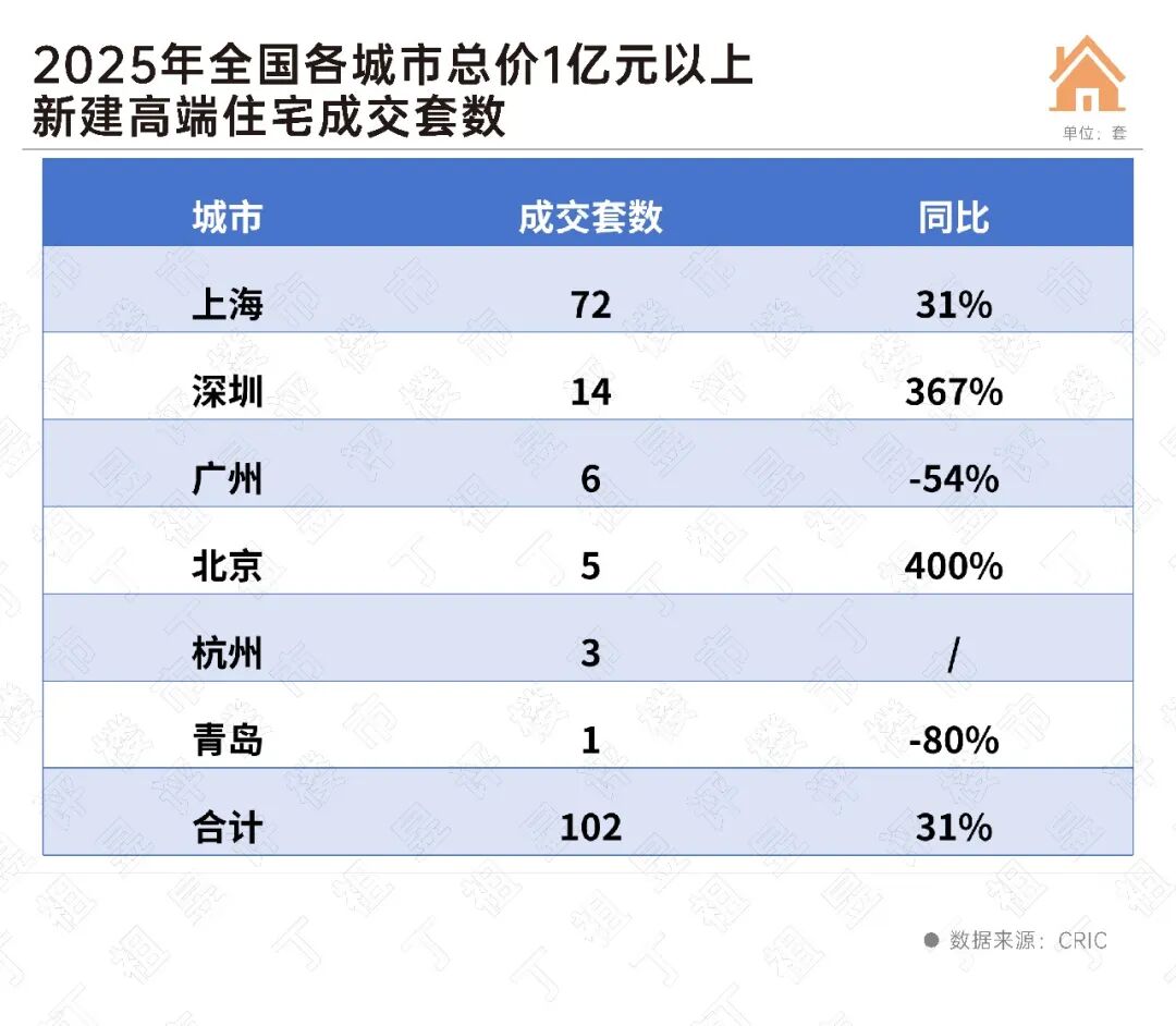 2025年上海单城就成交72套过亿豪宅,占比超七成。此外,深圳成交14套,同比2024年翻倍;广州、北京、杭州分别成交6套、5套和3套。