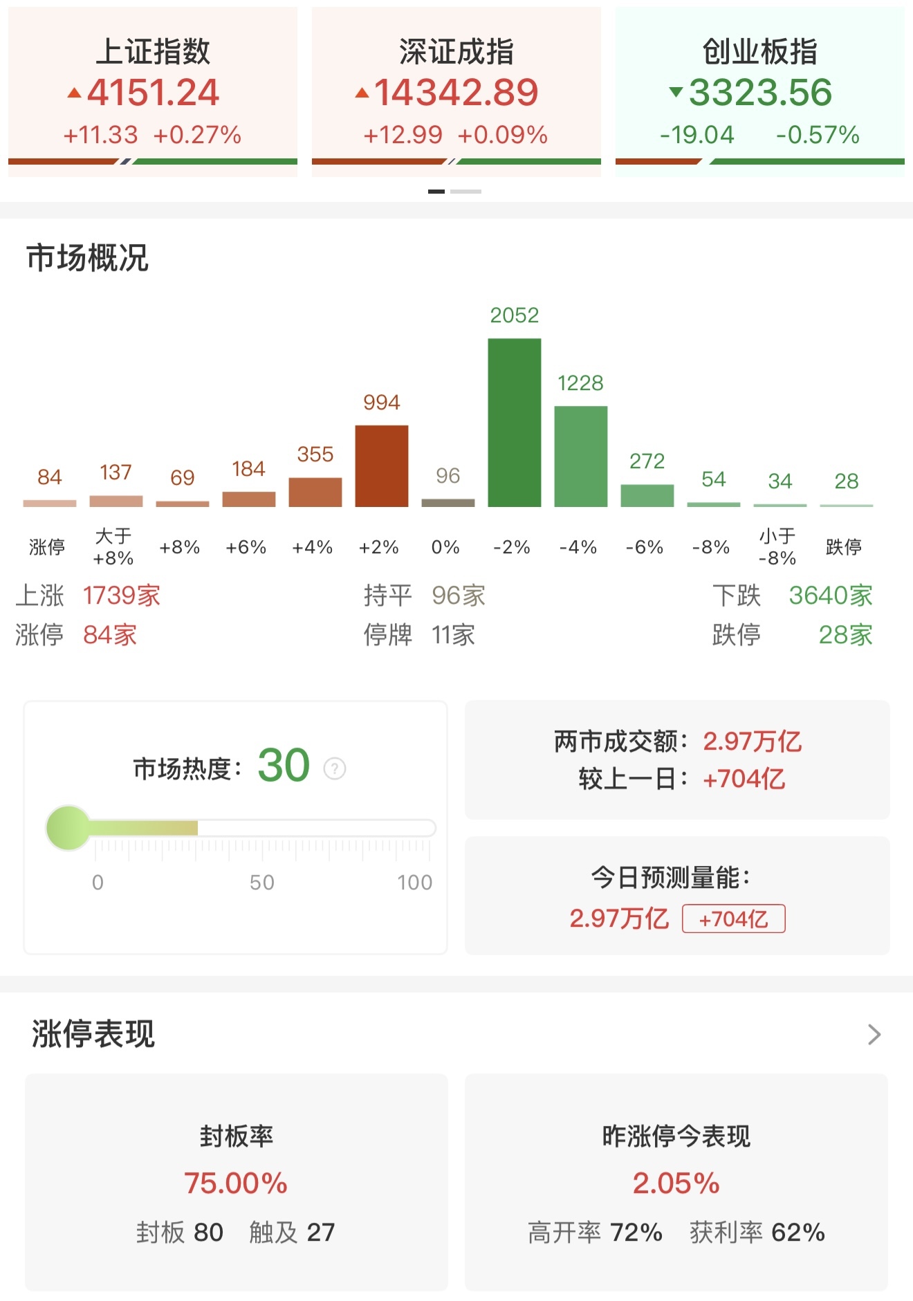 沪深两市当日成交总额达2.97万亿元,较前一交易日增加704亿元,市场交投活跃度有所提升。个股表现方面,全市场超3600只个股出现下跌,下跌个股数量占比较高。
