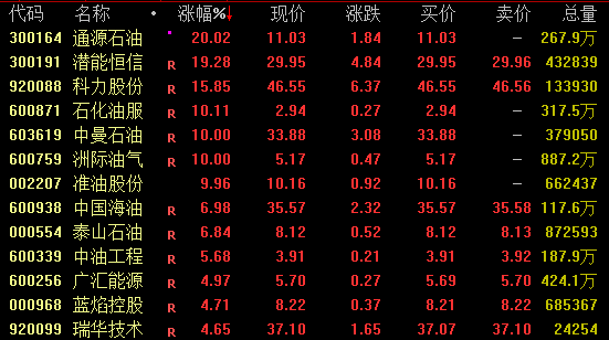 石油板块盘中强势拉升,截至收盘,通源石油20%涨停,科力股份涨超15%,石化油服、中曼石油等涨停,中国海油涨约7%续创历史新高,中国石油涨逾3%。