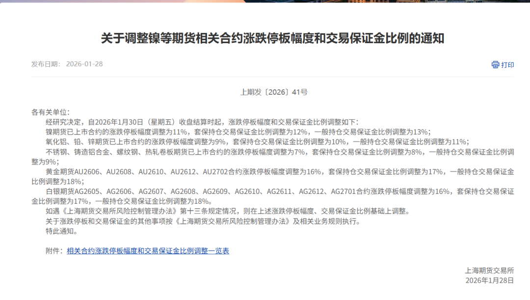 上期所28日发布公告,经研究决定,自2026年1月30日(星期五)收盘结算时起,调整部分期货合约的涨跌停板幅度和交易保证金比例:1.镍期货已上市合约的涨跌停板幅度调整为11%,套保持仓交易保证金比例调整为12%,一般持仓交易保证金比例调整为13%;2.氧化铝、铅、锌期货已上市合约的涨跌停板幅度调整为9%,套保持仓交易保证金比例调整为10%,一般持仓交易保证金比例调整为11%;3.不锈钢、铸造铝合金、螺纹钢、热轧卷板期货已上市合约的涨跌停板幅度调整为7%,套保持仓交易保证金比例调整为8%,一般持仓交易保证金比例调整为9%;4.黄金期货AU2606、AU2608、AU2610、AU2612、AU2702合约涨跌停板幅度调整为16%,套保持仓交易保证金比例调整为17%,一般持仓交易保证金比例调整为18%;5.白银期货AG2605、AG2606、AG2607、AG2608、AG2609、AG2610、AG2611、AG2612、AG2701合约涨跌停板幅度调整为16%,套保持仓交易保证金比例调整为17%,一般持仓交易保证金比例调整为18%。