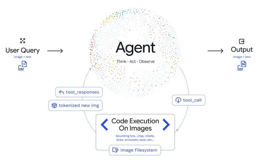 DeepMind的方法核心是将代码执行作为视觉推理工具,把被动视觉理解转化为主动智能体过程。当前SOTA模型通常一次性处理图像,而Agentic Vision构建了循环机制: