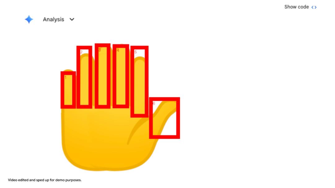 模型可通过标注与图像交互。例如数Gemini应用中手上的数字时,它用Python在每个手指上绘制边界框和数字标签,以‘视觉草稿纸’确保答案基于像素级理解。
