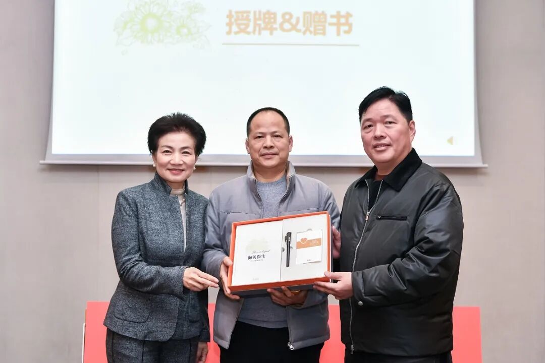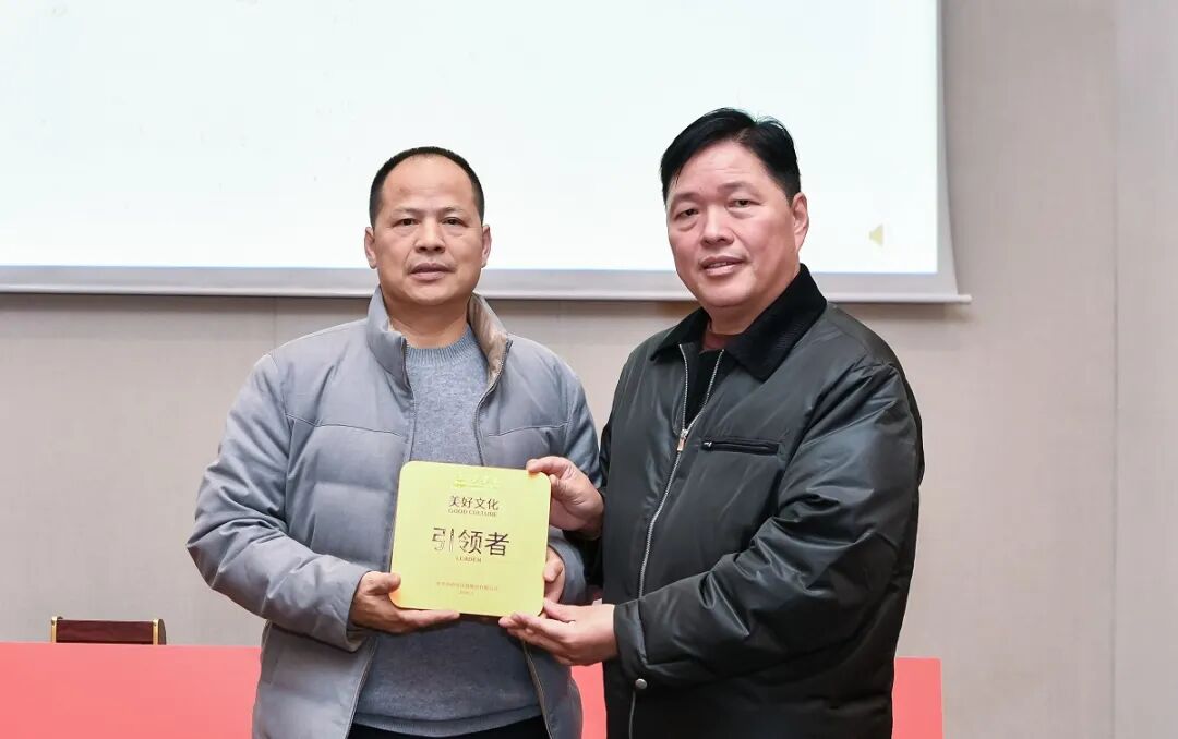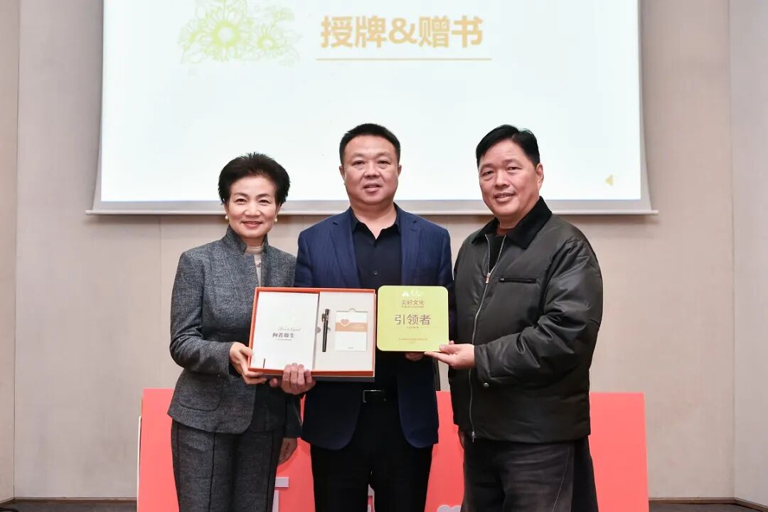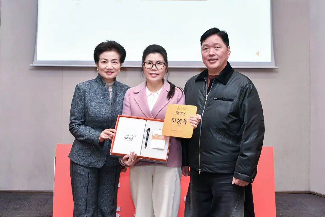 仪式现场,授牌环节备受瞩目。董事长王填与联合创始人张海霞共同将刻有“美好文化引领者”的牌匾,以及文化共创成果“三件套”授予三位轮值总裁——这不仅是荣誉的象征,更是精神的传递,标志着文化传承的使命从核心层延伸至执行终端。