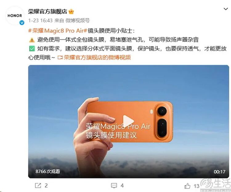 2026年1月23日,荣耀Magic8 RSR与Magic8 Pro Air两款新机开售当天,@荣耀官方旗舰店 发布提醒,建议用户避免使用一体式全包镜头膜,因其“易堵塞泄气孔,可能引发扬声器杂音”。