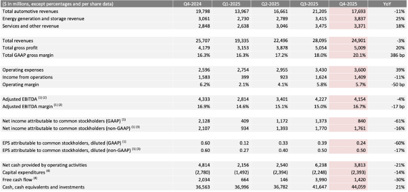 值得关注的是,尽管收入面临压力,特斯拉第四季度GAAP综合毛利率升至20.1%,较去年同期提升3.86个百分点,成本控制与业务结构优化开始显现成效。