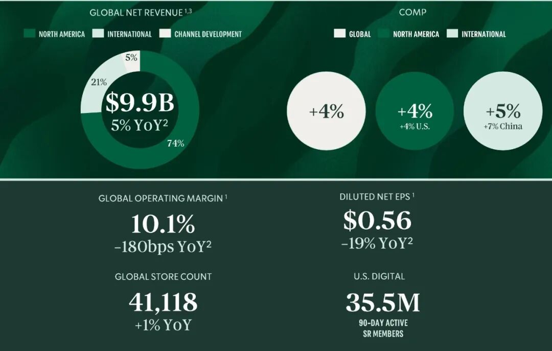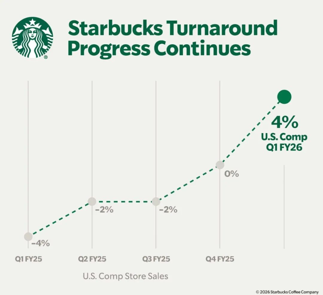2026财年第一季度,星巴克全球同店销售额增长了4%,客流量增长了3%。作为占比最大的市场,美国市场的同店销售额也增长了4%,这主要得益于节日特饮的需求增长。