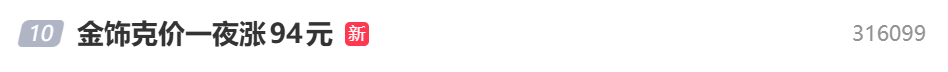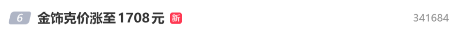 品牌金饰的价格也随之上扬,“金饰克价涨至1708元”“金饰克价一夜涨94元”等相关话题登上微博热搜榜单。