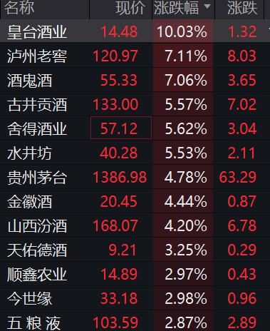 具体来看,皇台酒业率先涨停,领涨板块;泸州老窖与酒鬼酒涨幅均超7%,表现亮眼;古井贡酒、舍得酒业、水井坊的涨幅也突破5%;贵州茅台、山西汾酒等头部酒企涨幅同样超过4%,板块整体涨势强劲。