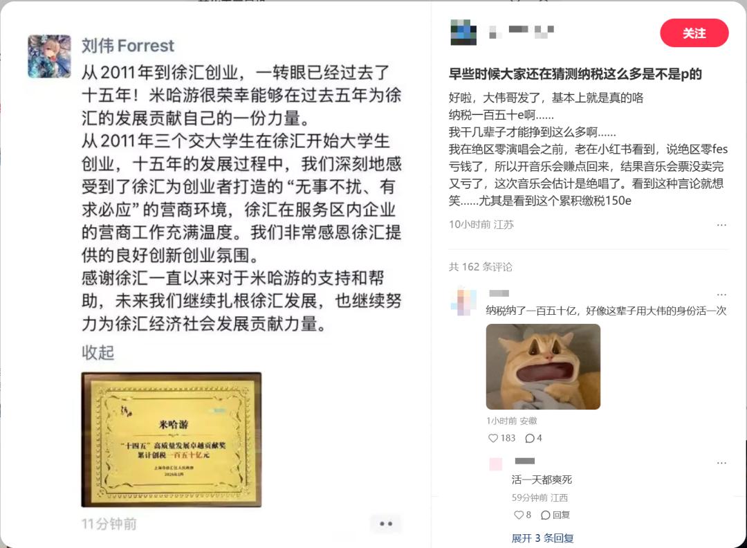 米哈游官宣五年累计纳税150亿 刘伟致谢徐汇区