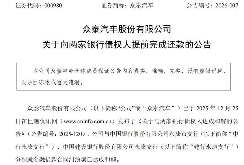 1月26日晚间,众泰汽车(000980.SZ)发布《关于向两家银行债权人提前完成还款的公告》,公告显示,公司已向中国银行股份有限公司永康支行(以下简称中行永康支行)、中国建设银行股份有限公司永康支行(以下简称建行永康支行)分别偿还剩余债务约2.12亿元和1.73亿元,两笔还款合计约3.85亿元。