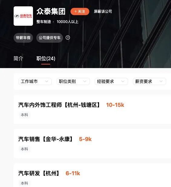 记者查询猎聘网招聘信息发现,众泰集团当前有24个招聘岗位,涵盖整车研发、整车热管理工程师、电控开发工程师、电机研发工程师、电池工程师、车联网工程师,以及汽车销售、法务、审计、成本、采购、证券事务专员等,工作地点分布在金华和杭州。